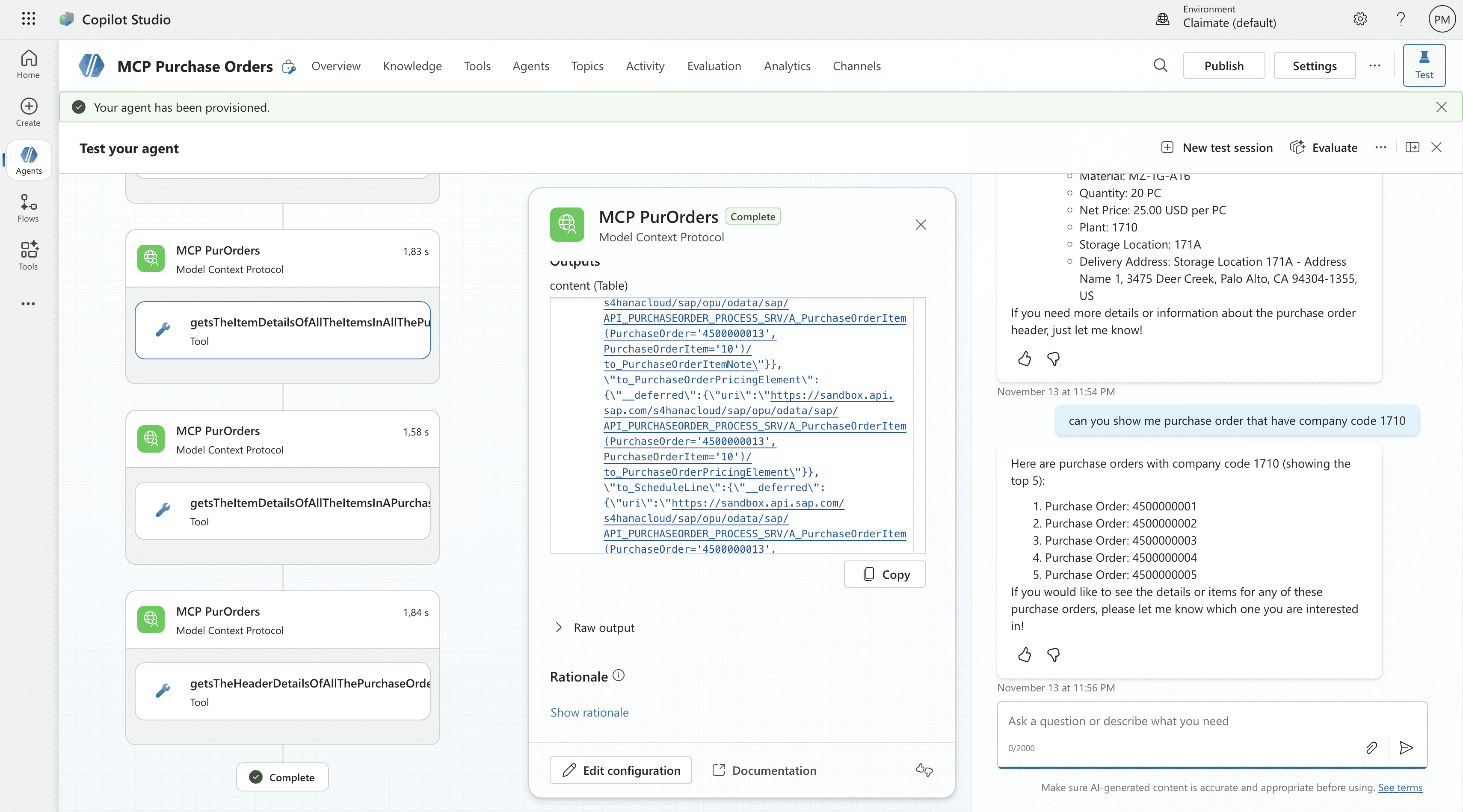 Copilot was able to query real SAP Purchase Order data through a secure and controlled APIM gateway.