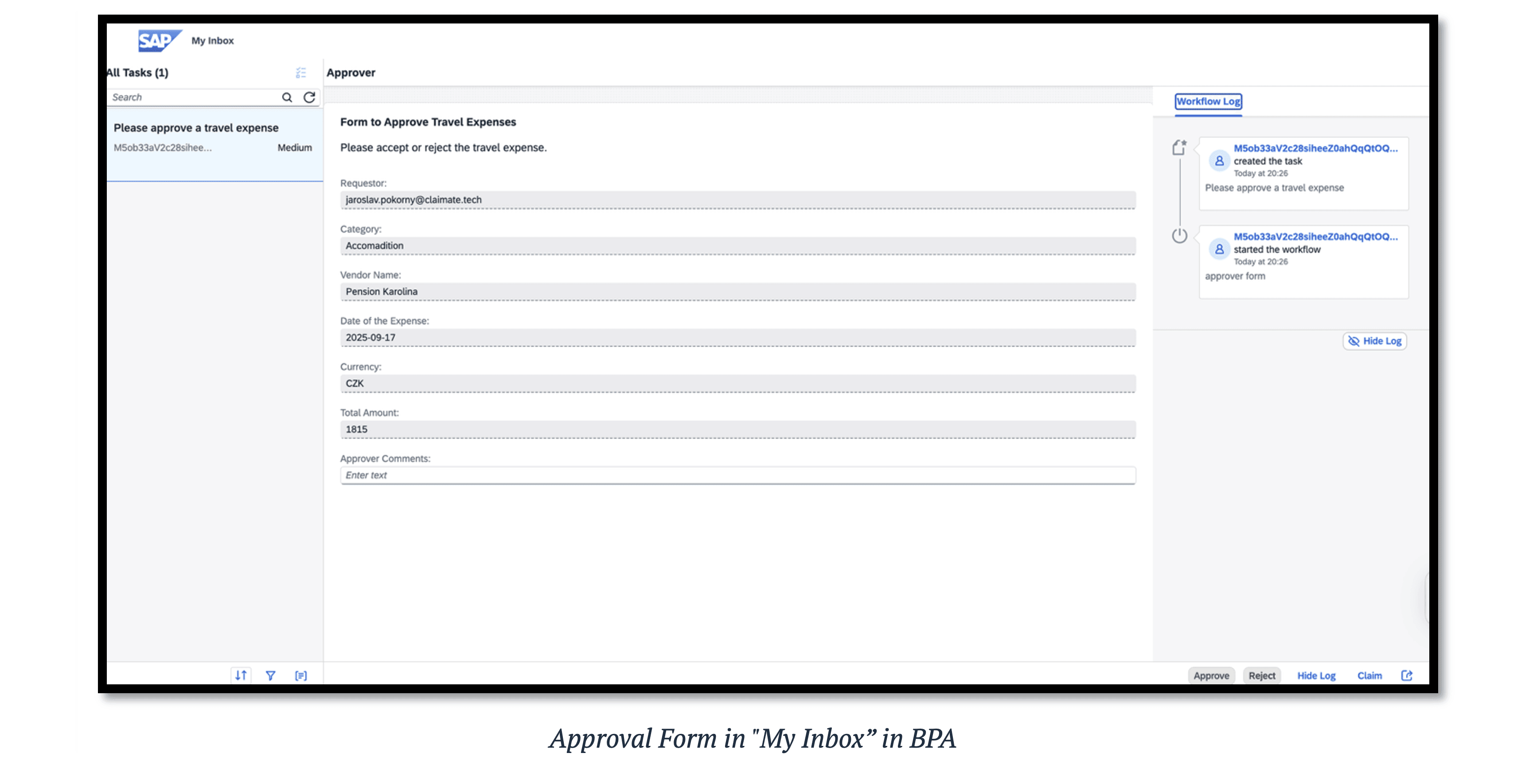 Decoupling: From this moment, responsibility for the process is handed off. BPA handles all business logic (who approves, what happens on rejection, escalations) and ensures a full audit trail. The manager sees the task in their "My Inbox."