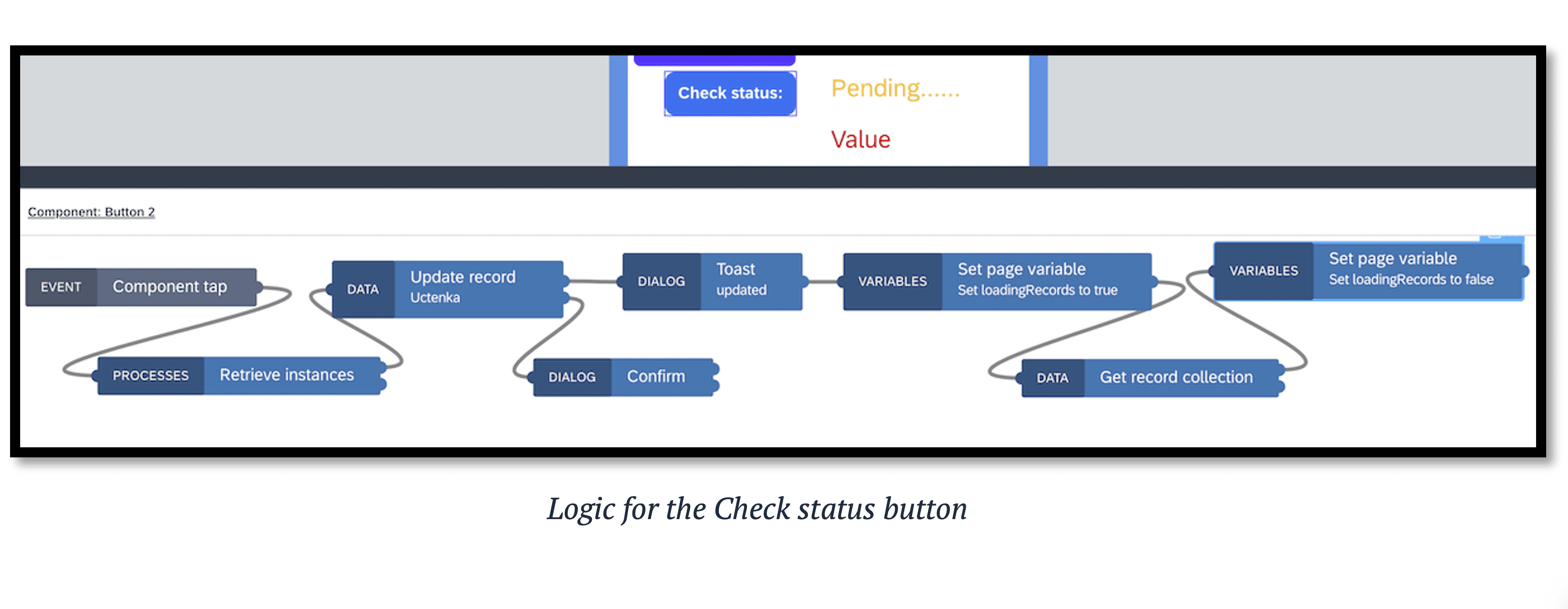 Status Monitoring: The "Check Status" function in the mobile app is realized by another API call that retrieves the current status of the running workflow instance from BPA.